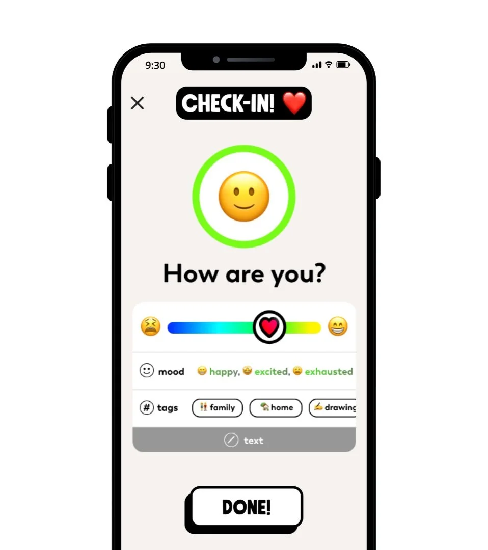 Check-in using our simple slider. Go deeper by tagging a mood, what you’re up to or a note